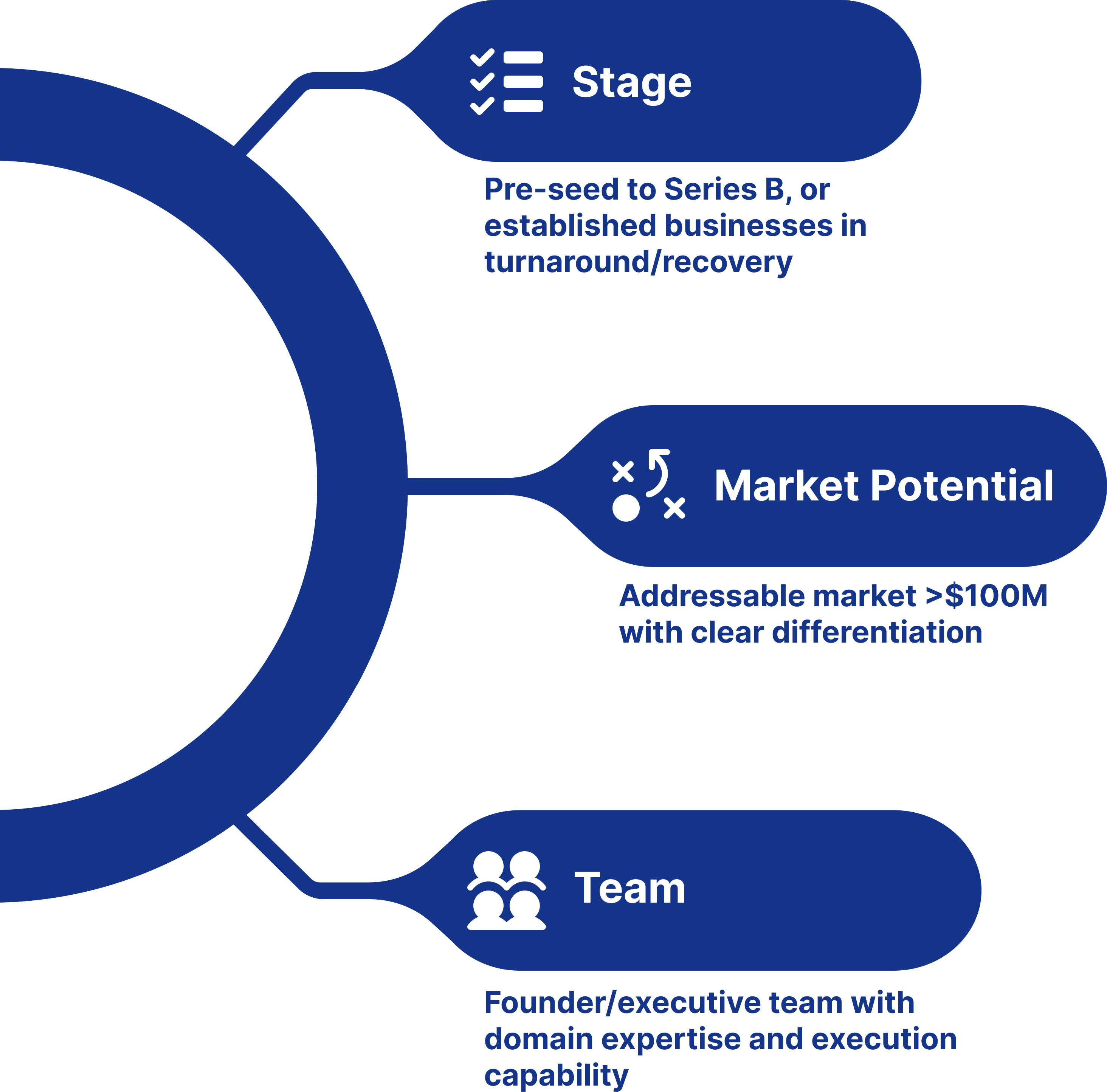 We look for partners with a compelling vision, strong leadership, and a clear market opportunity. While every company is unique, our most successful partnerships share these characteristics.